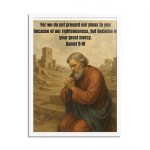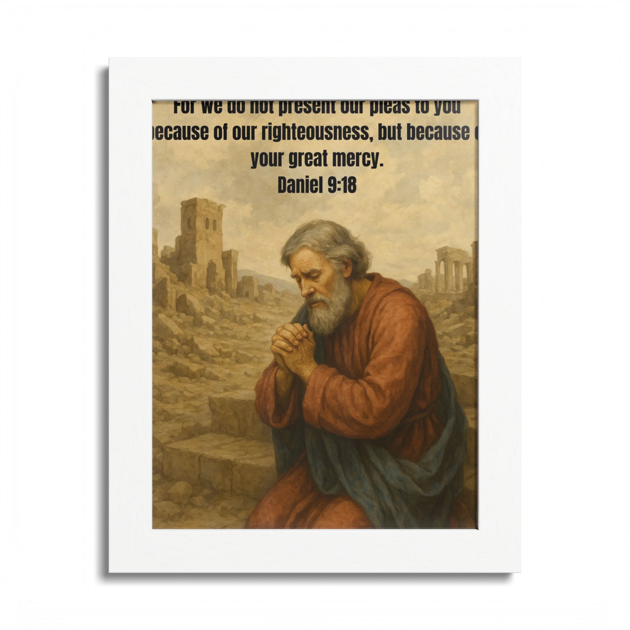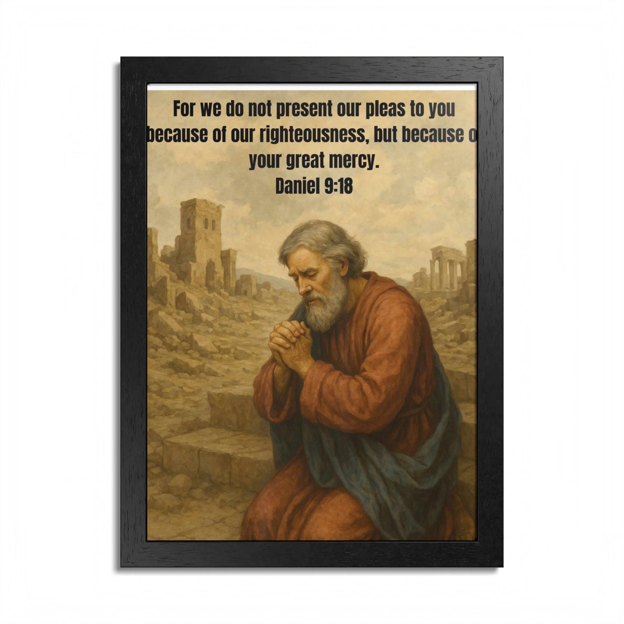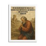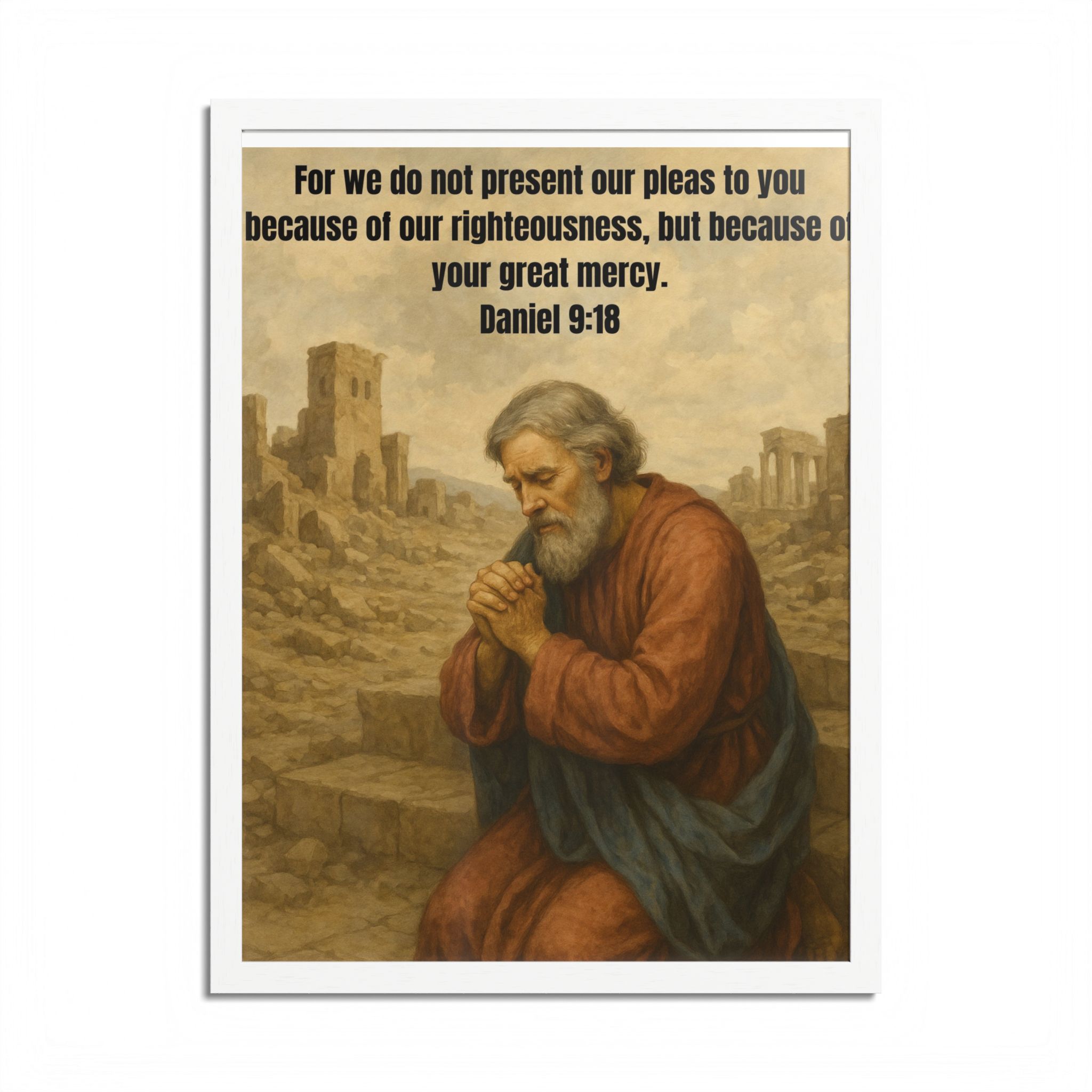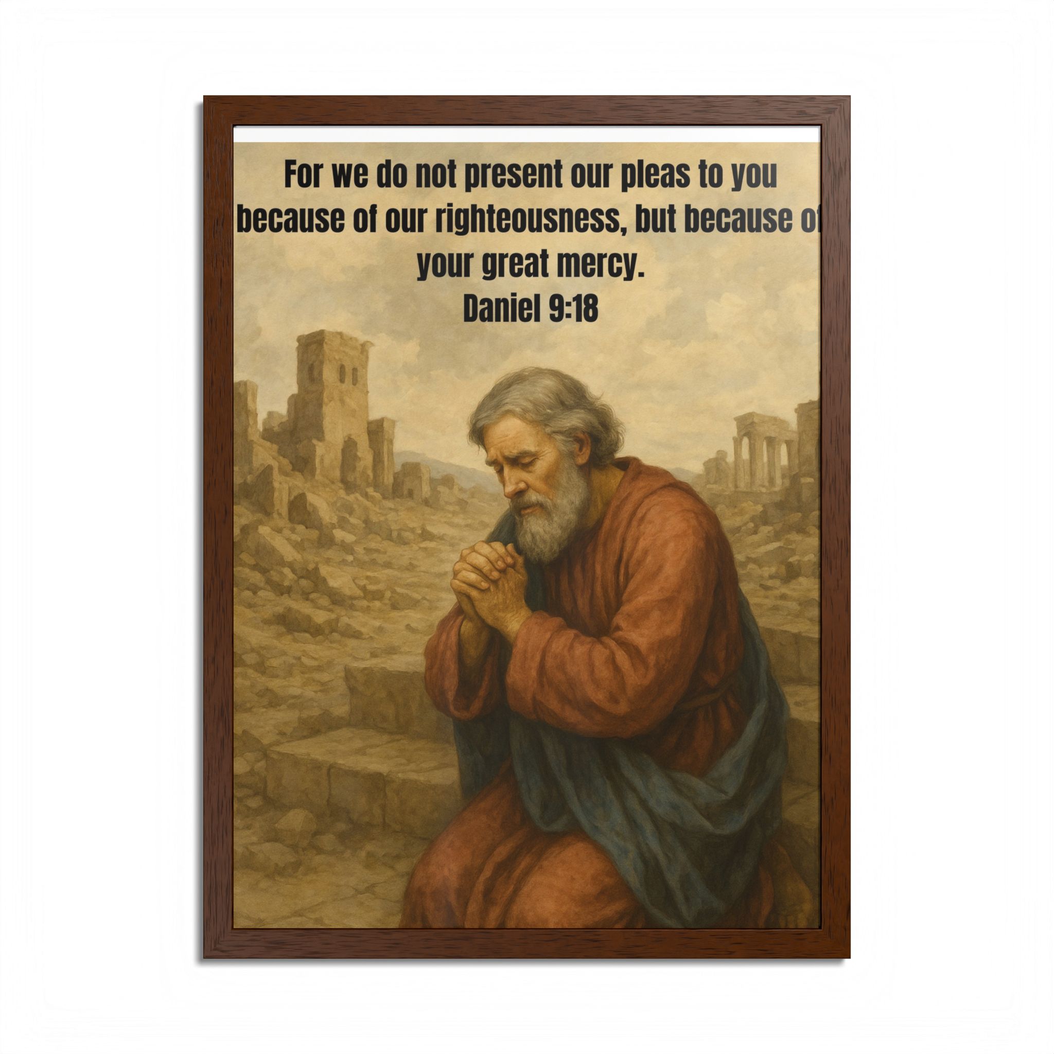 This image of Daniel kneeling amid ruins reflects a humble posture — honest, dependent, surrendered. It reminds us that our hope never rests in our goodness, but in God’s mercy alone.