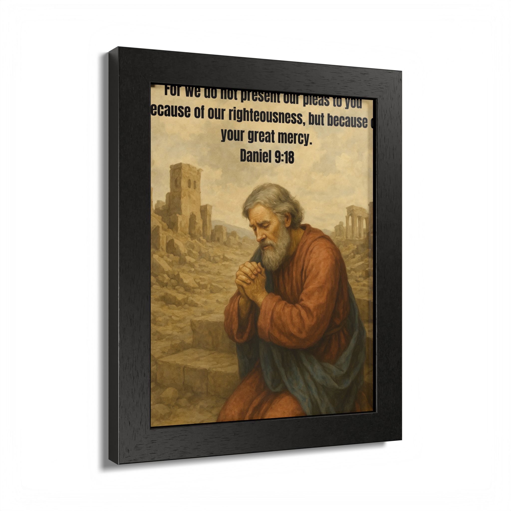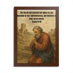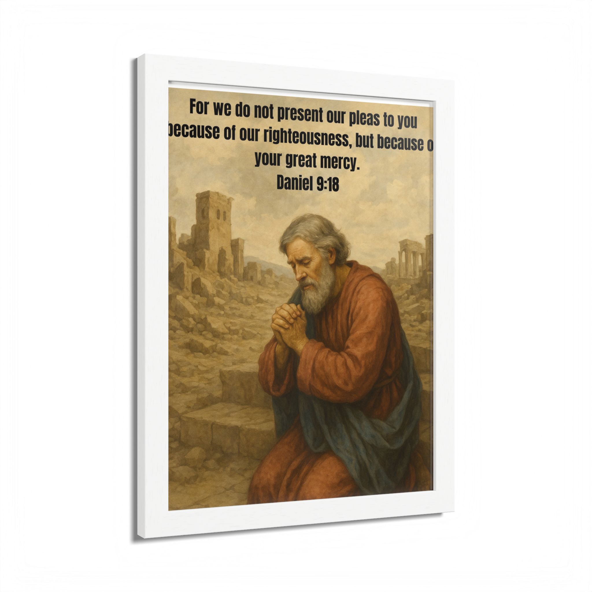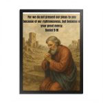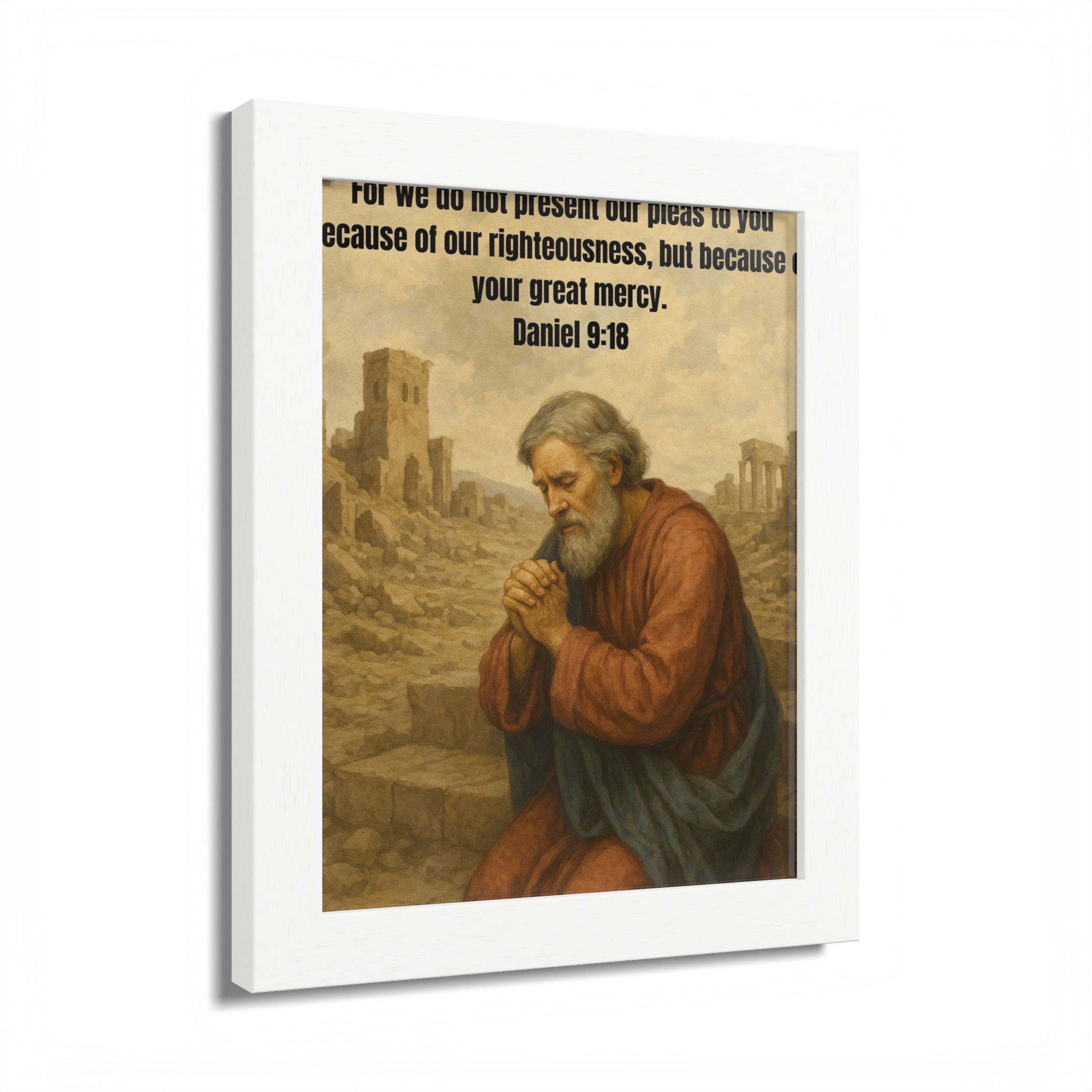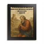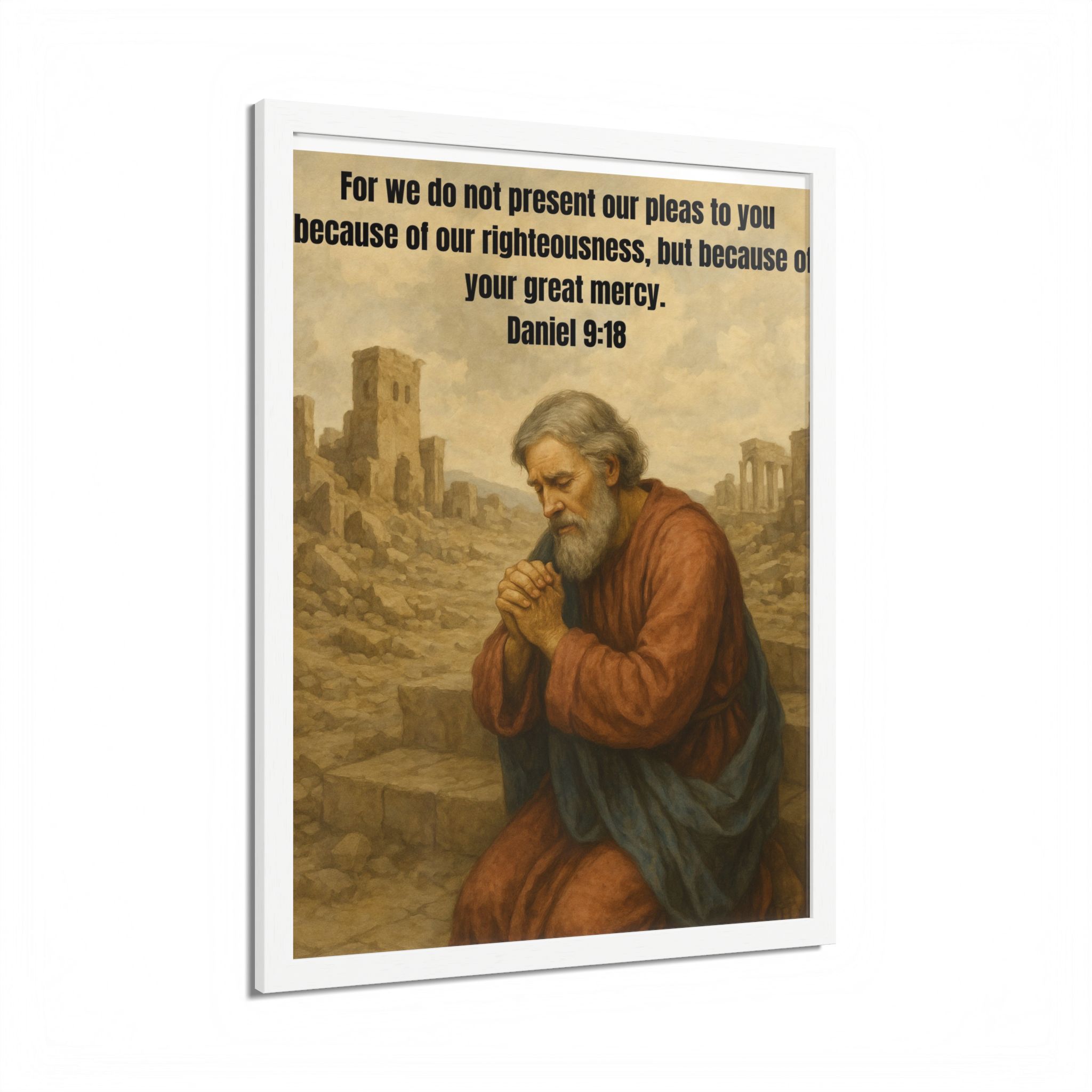 This image of Daniel kneeling amid ruins reflects a humble posture — honest, dependent, surrendered. It reminds us that our hope never rests in our goodness, but in God’s mercy alone.