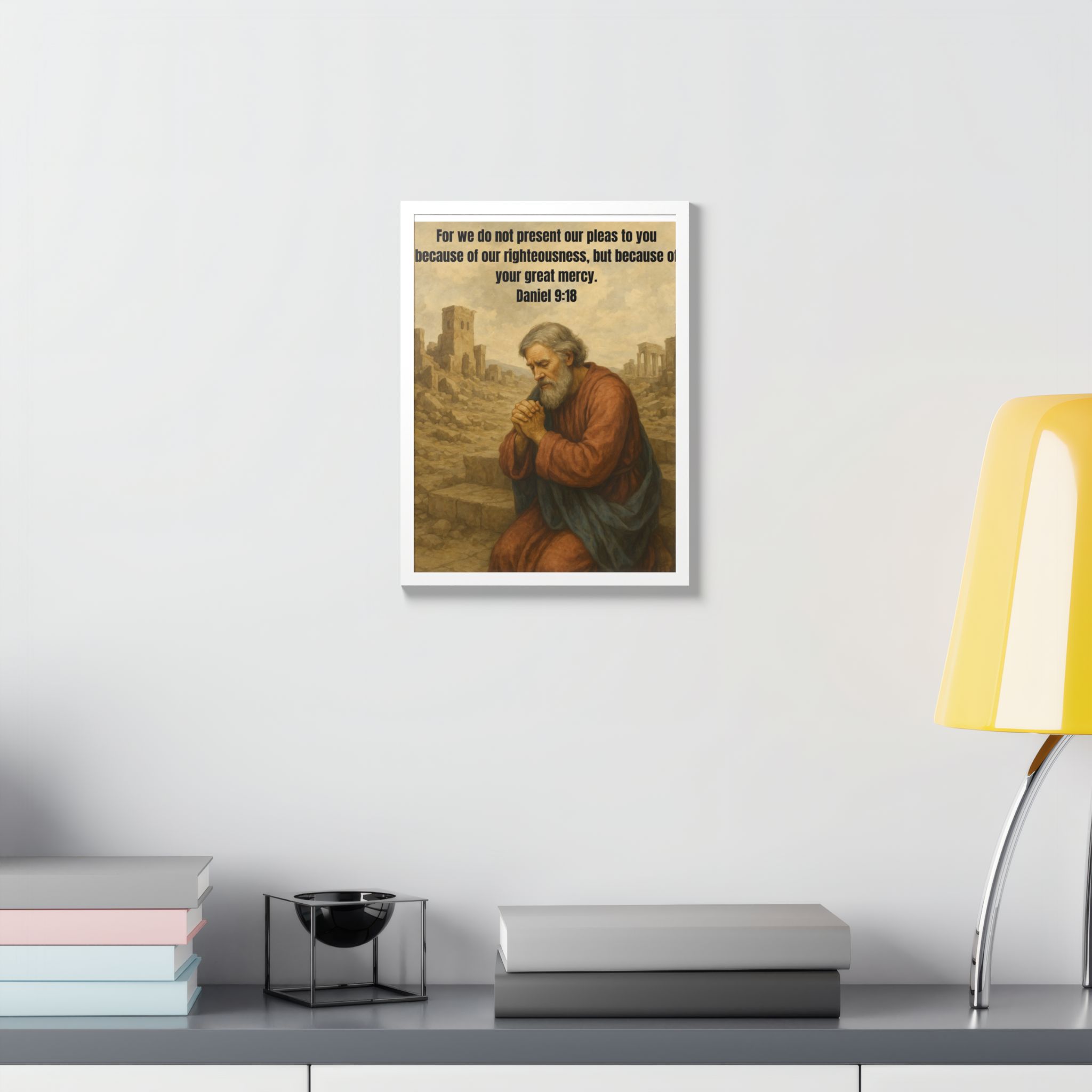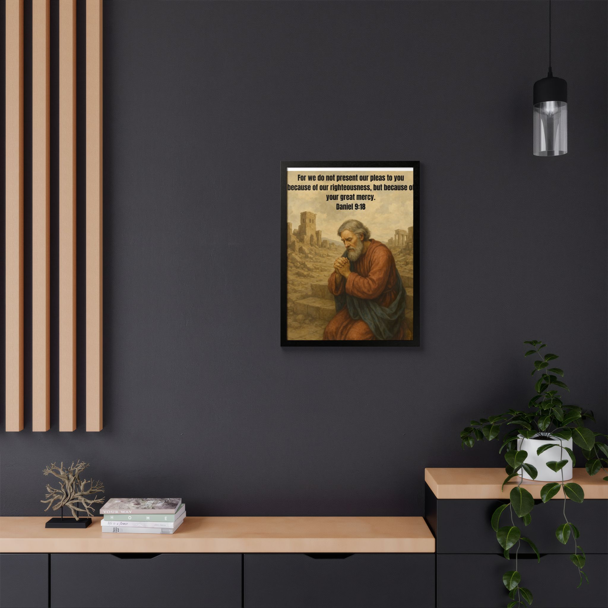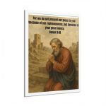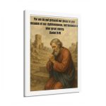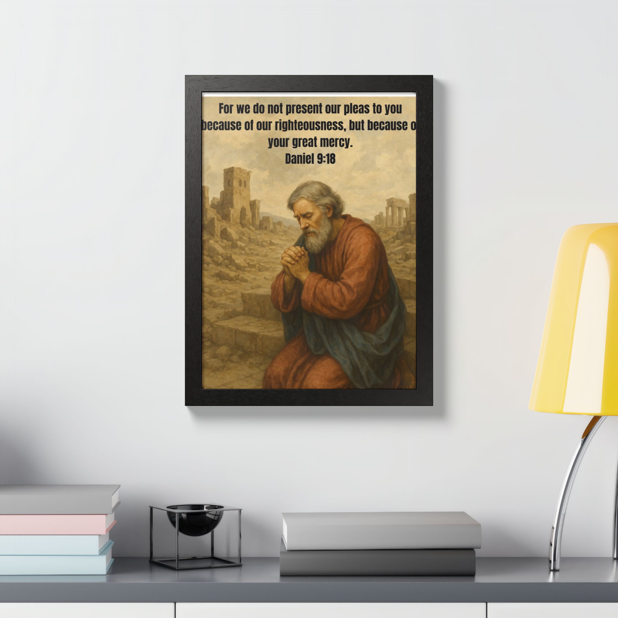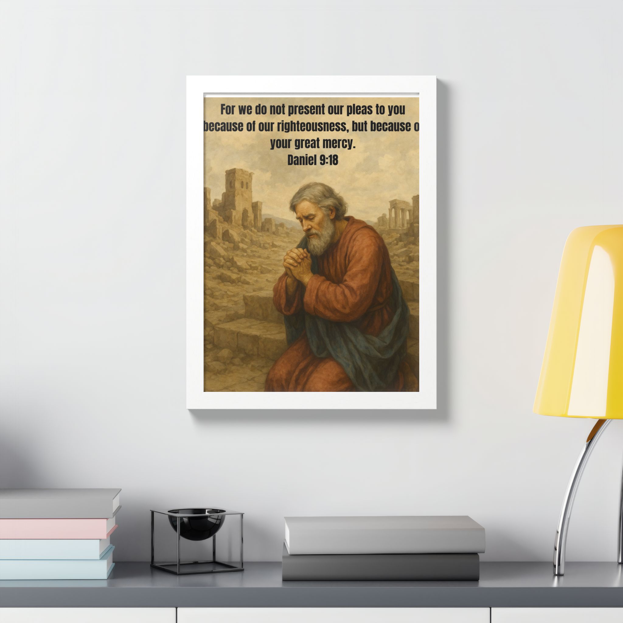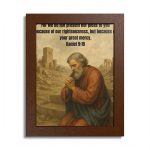 This image of Daniel kneeling amid ruins reflects a humble posture — honest, dependent, surrendered. It reminds us that our hope never rests in our goodness, but in God’s mercy alone.