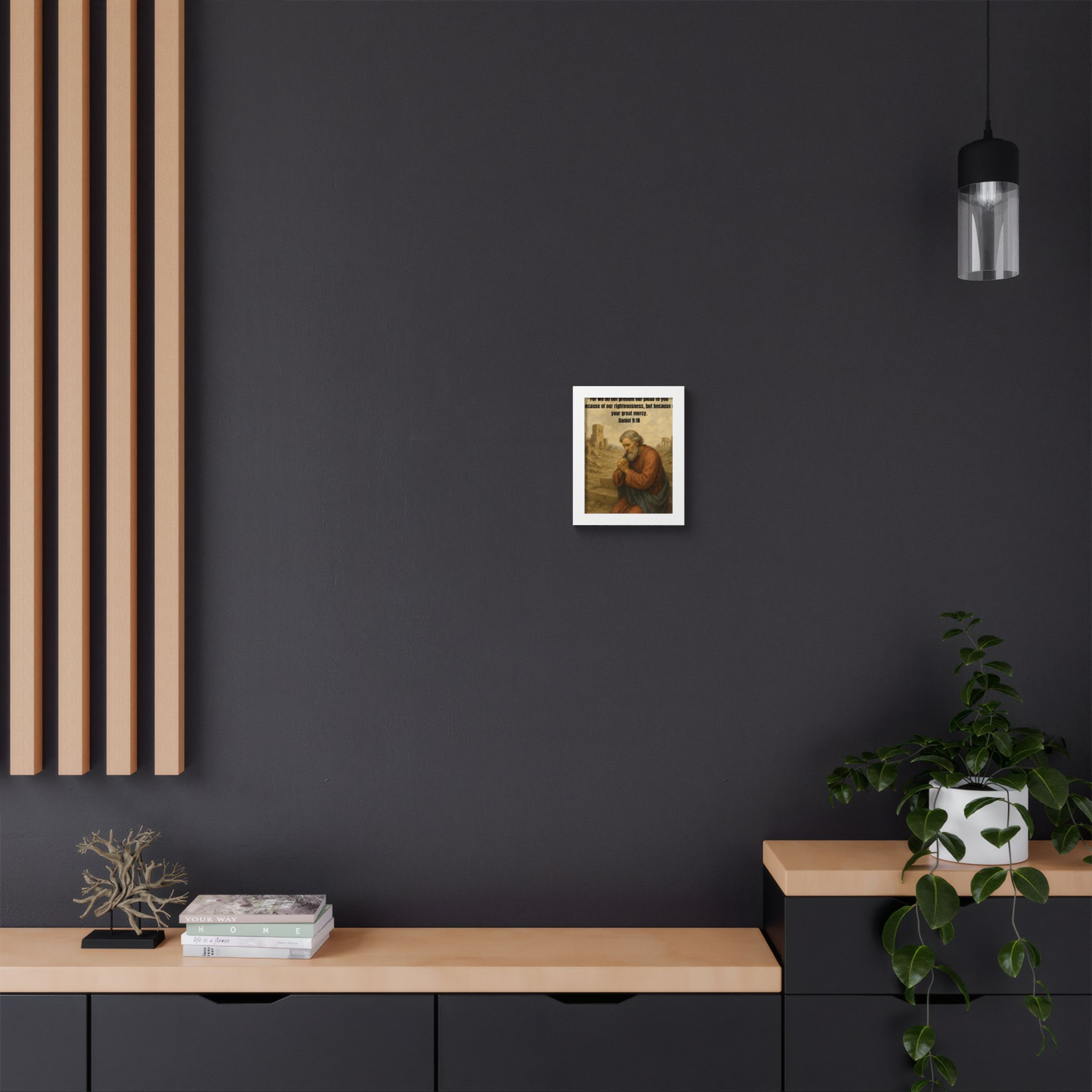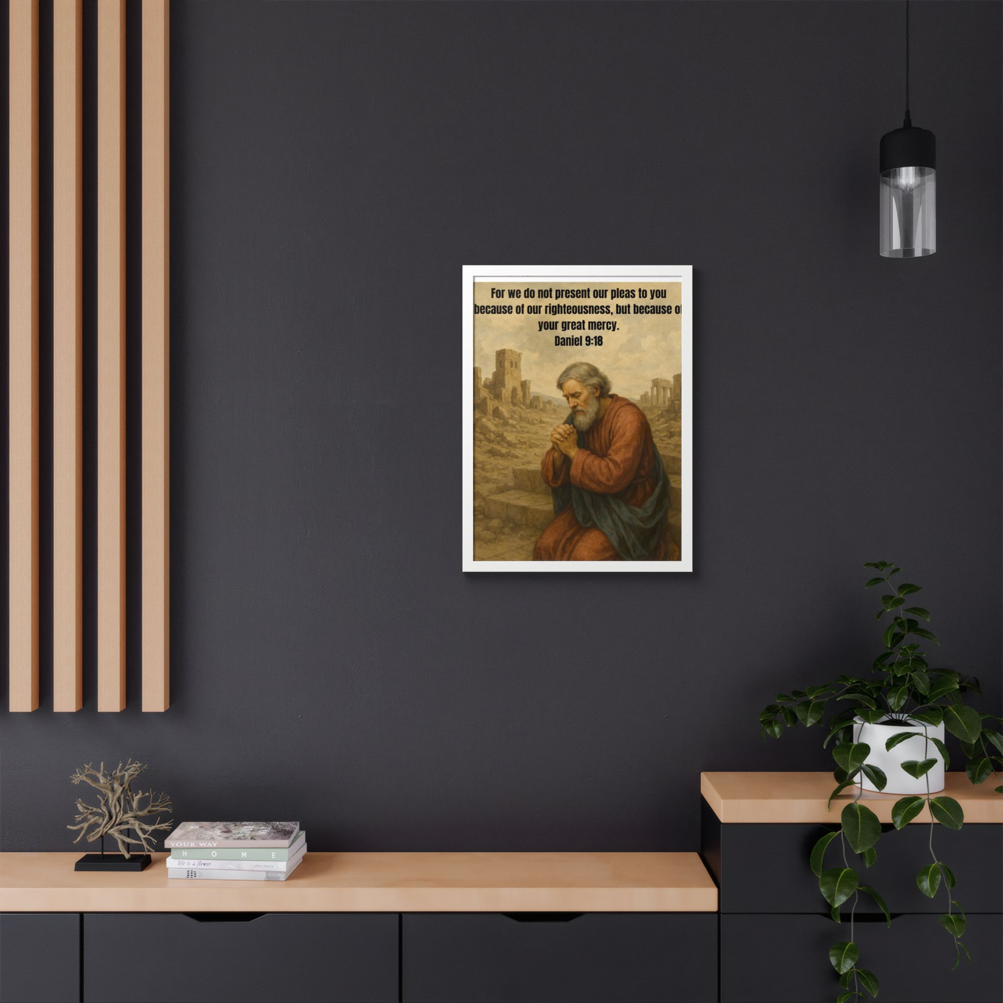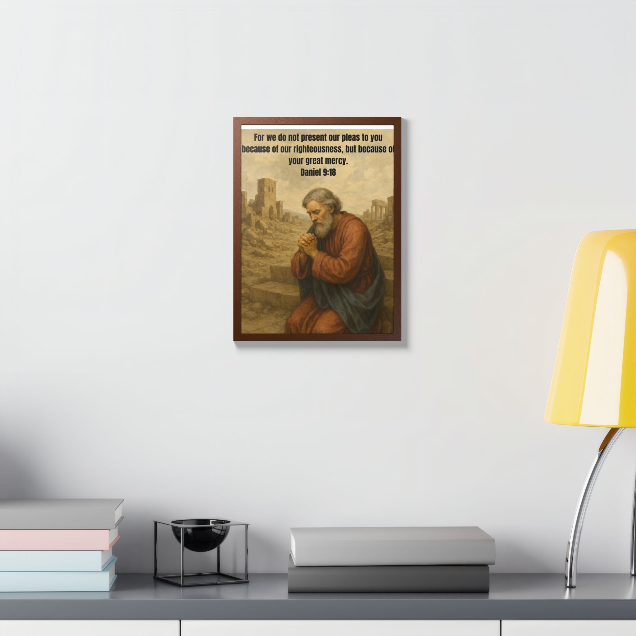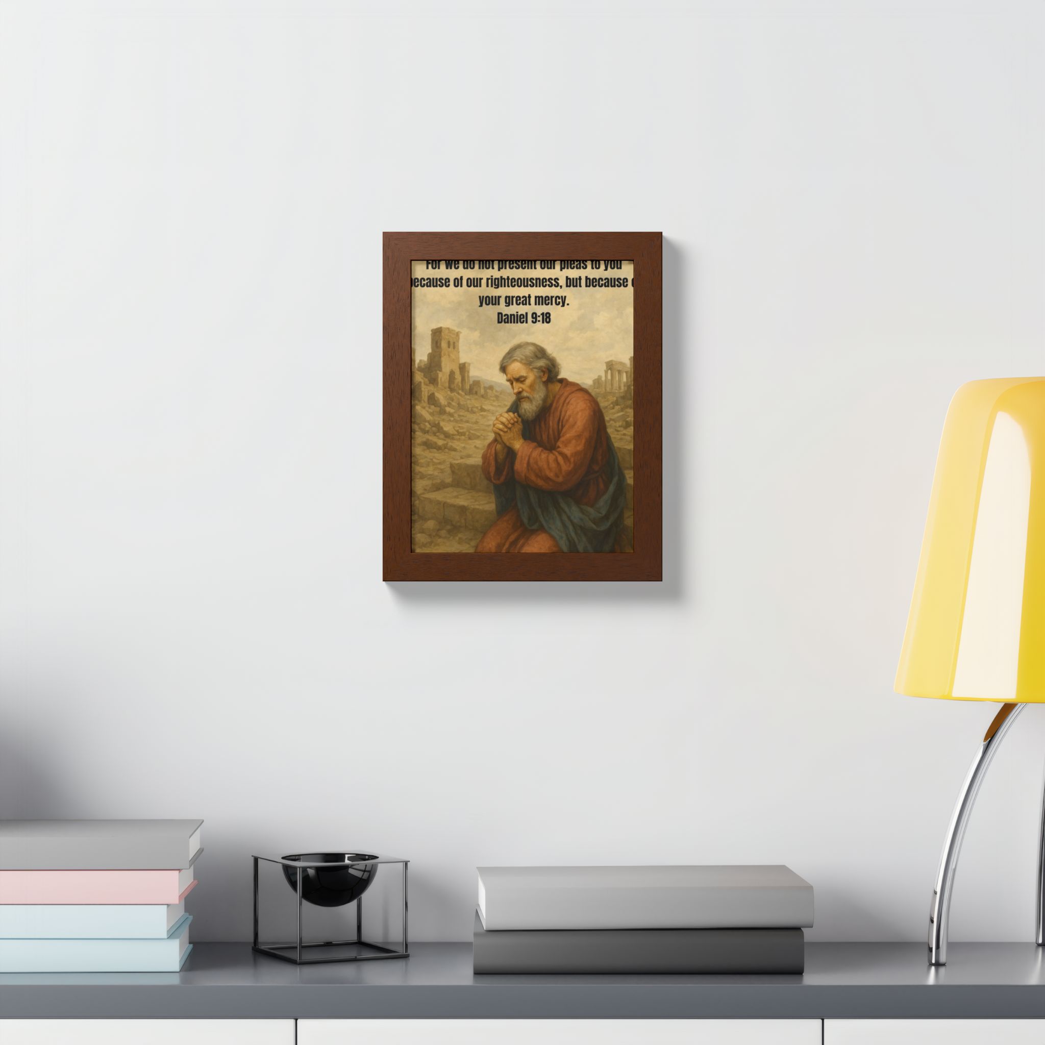 This image of Daniel kneeling amid ruins reflects a humble posture — honest, dependent, surrendered. It reminds us that our hope never rests in our goodness, but in God’s mercy alone.