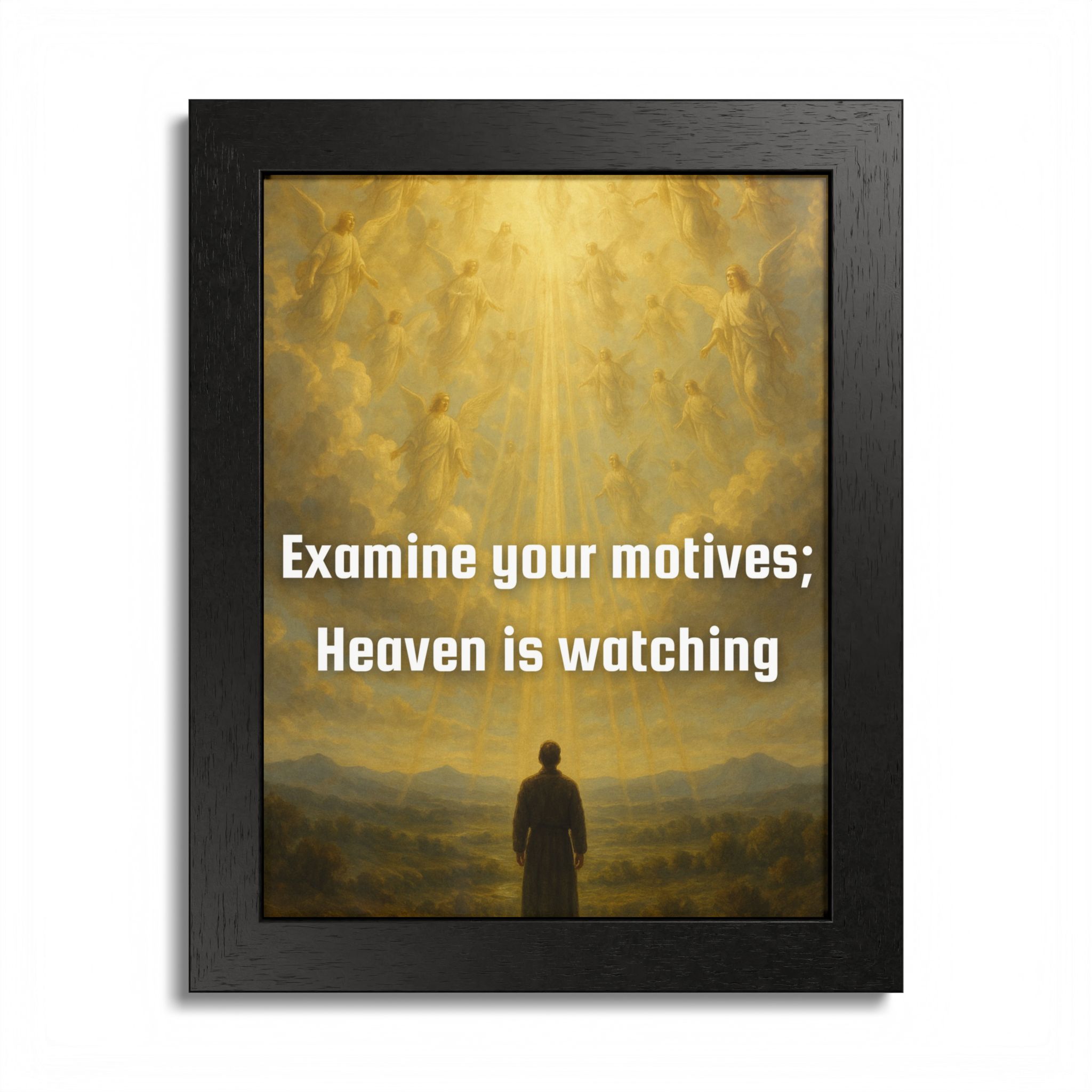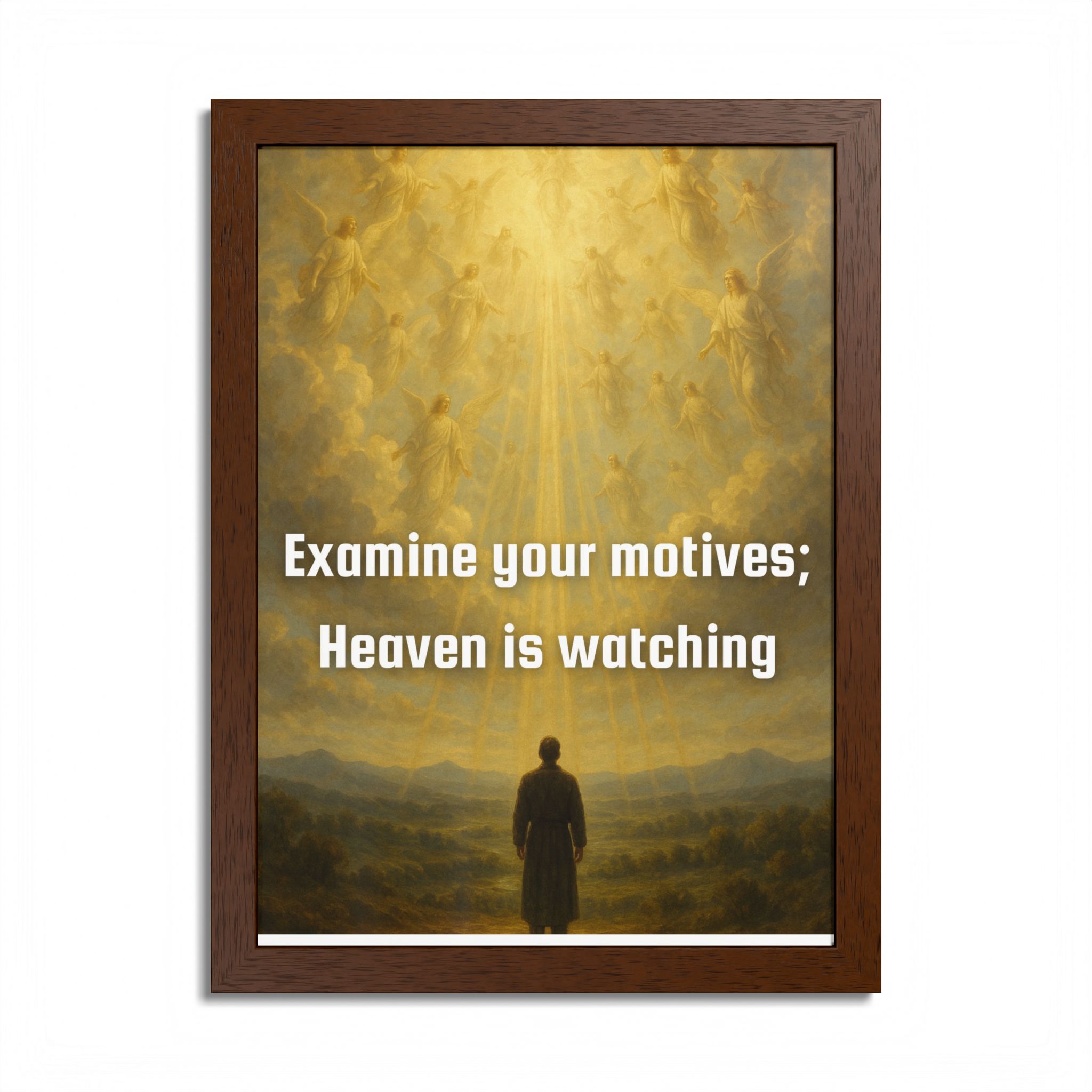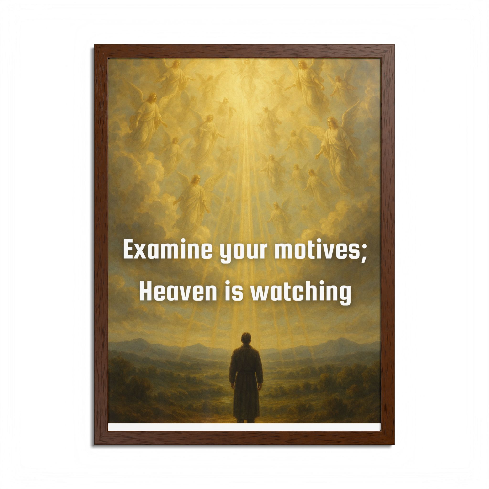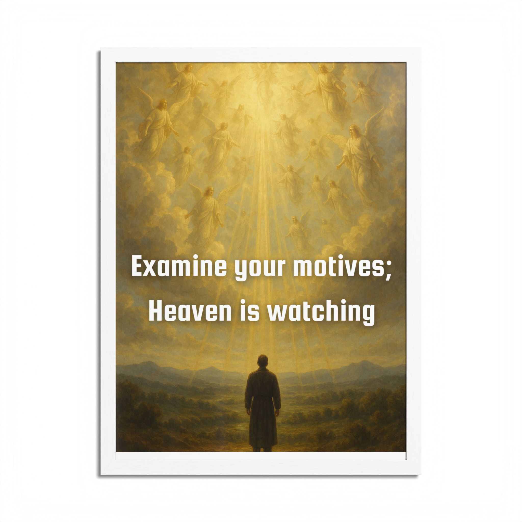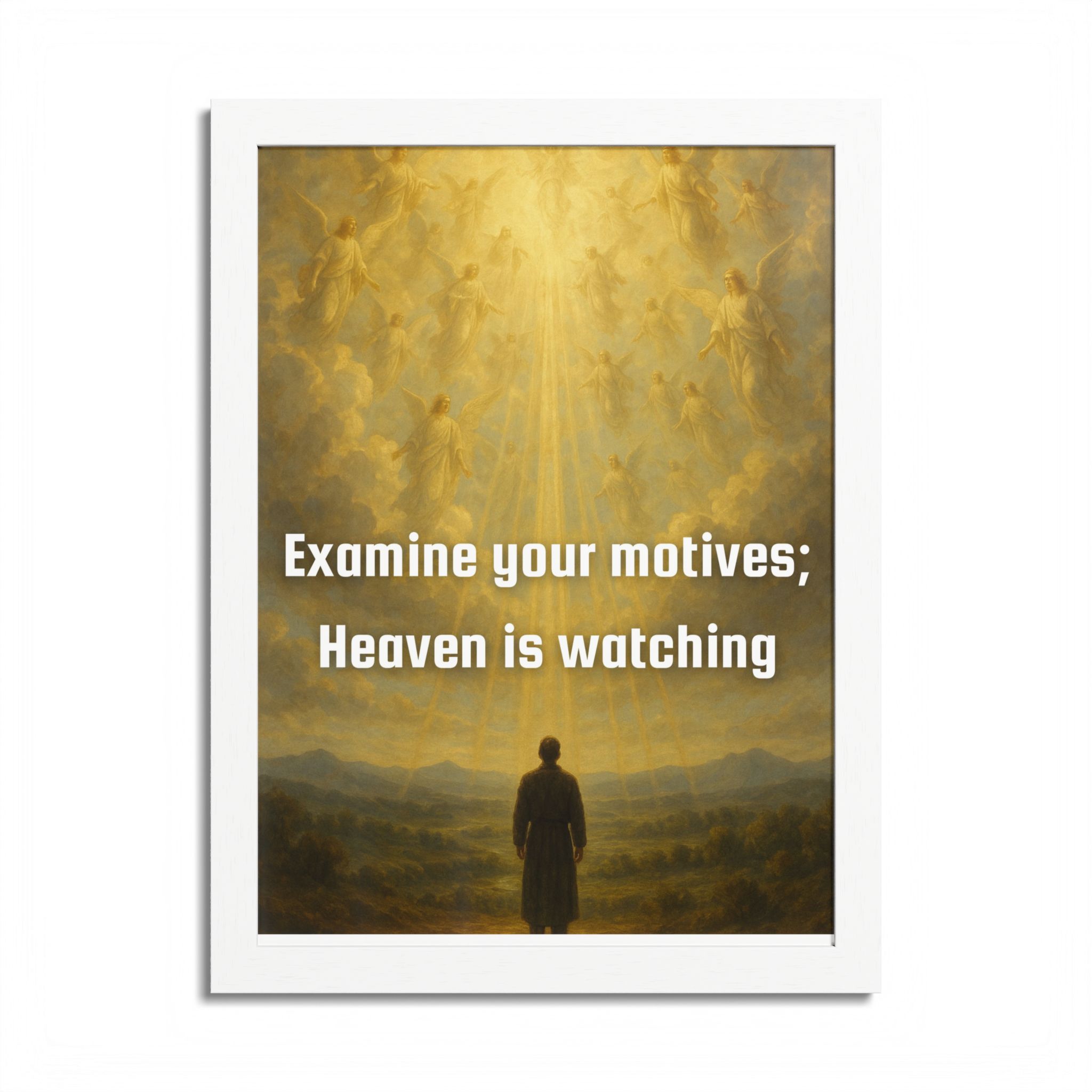 Set beneath a radiant host of angels, this poster is a gentle yet sobering reminder that our motives matter. Heaven sees not only what we do, but why we do it. This piece invites introspection, integrity, and purity of heart.