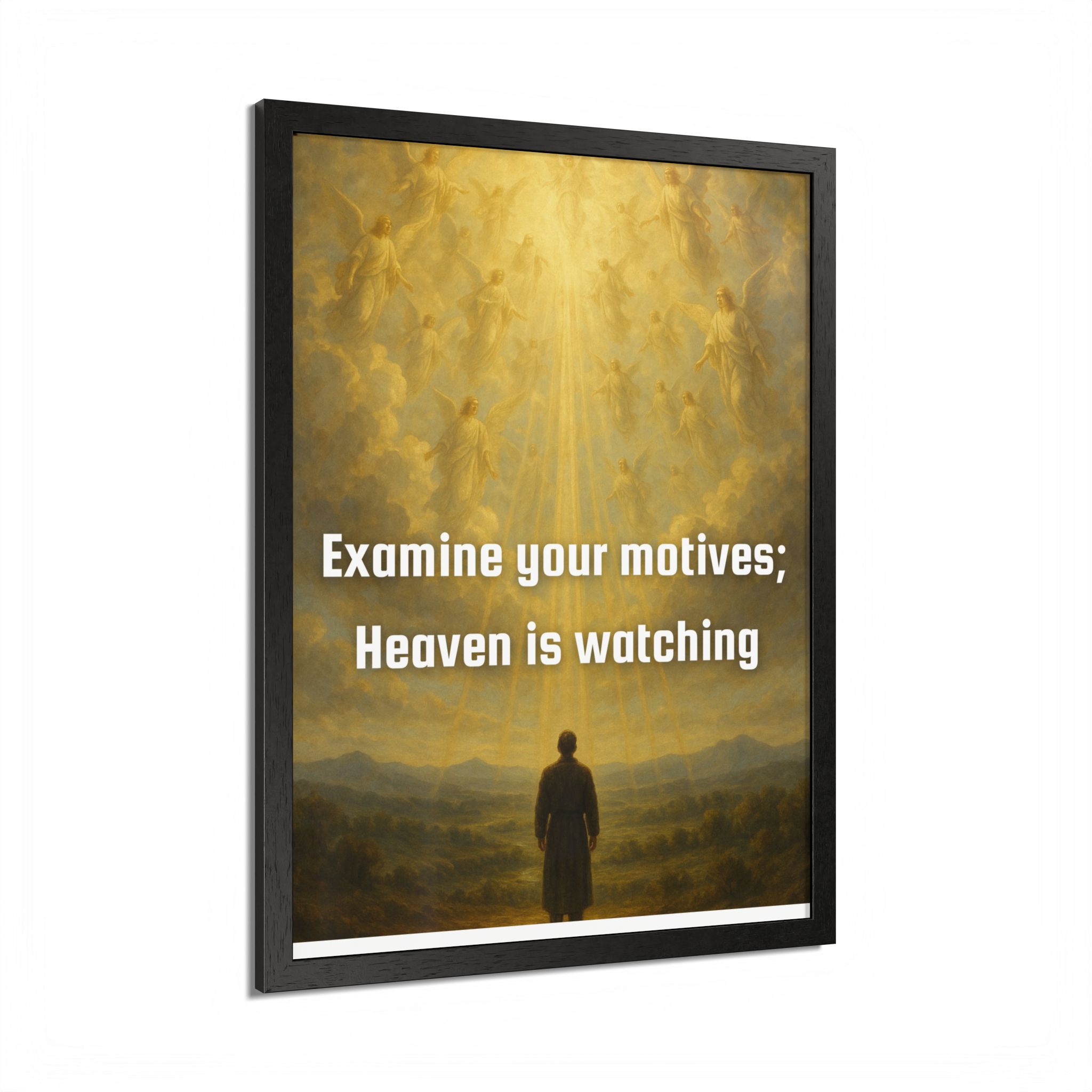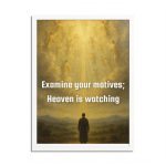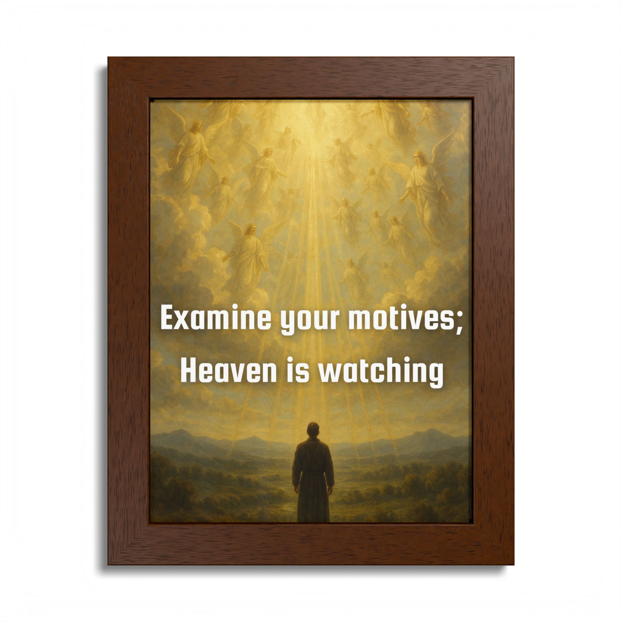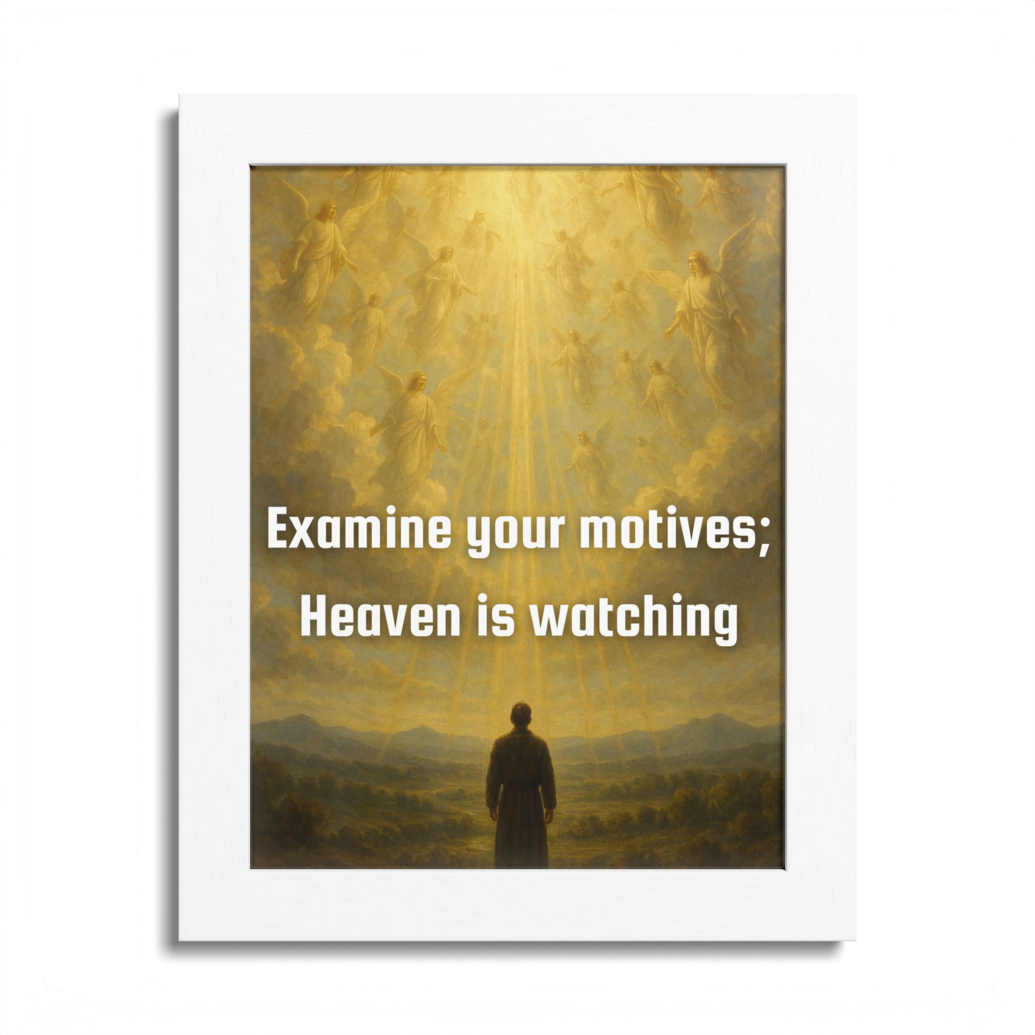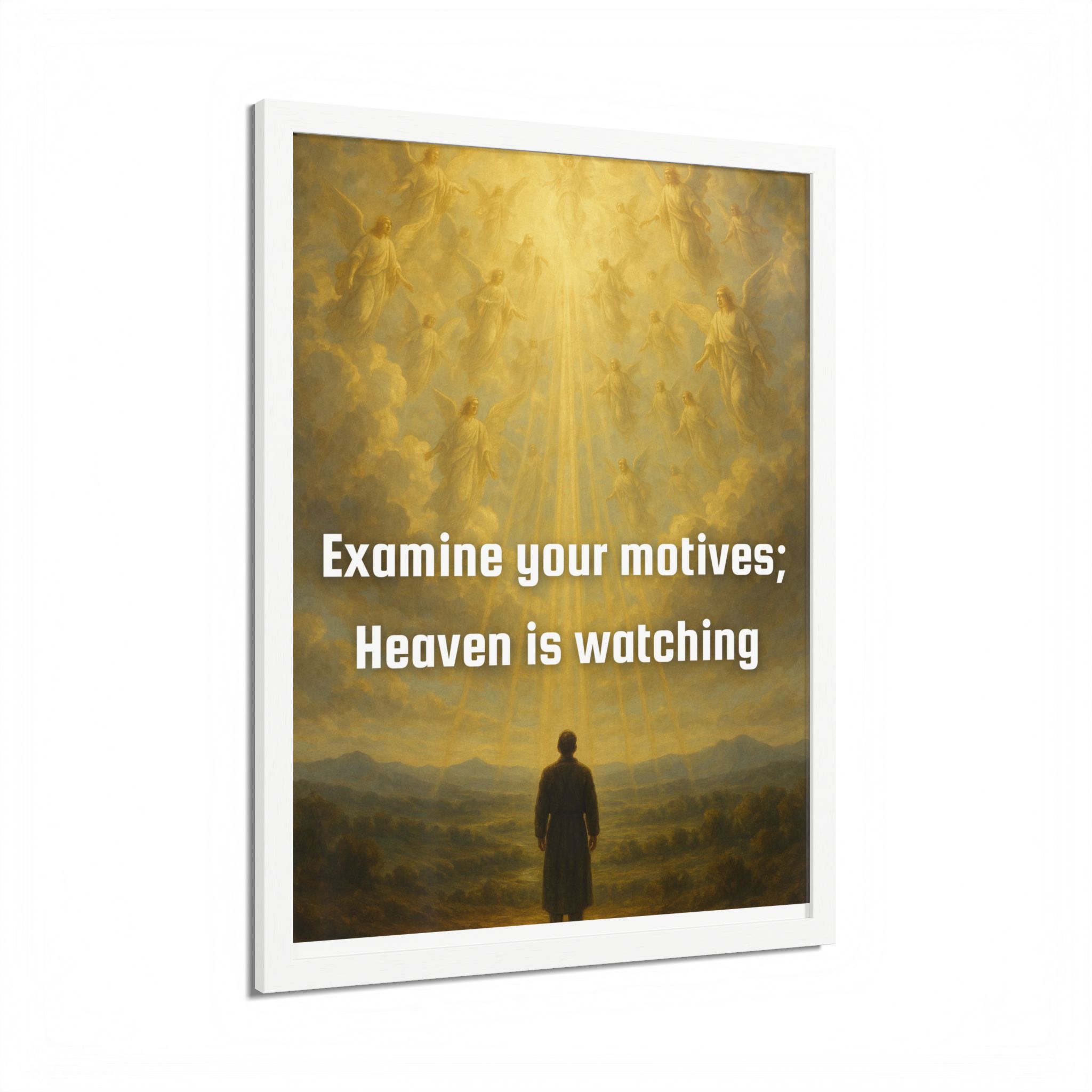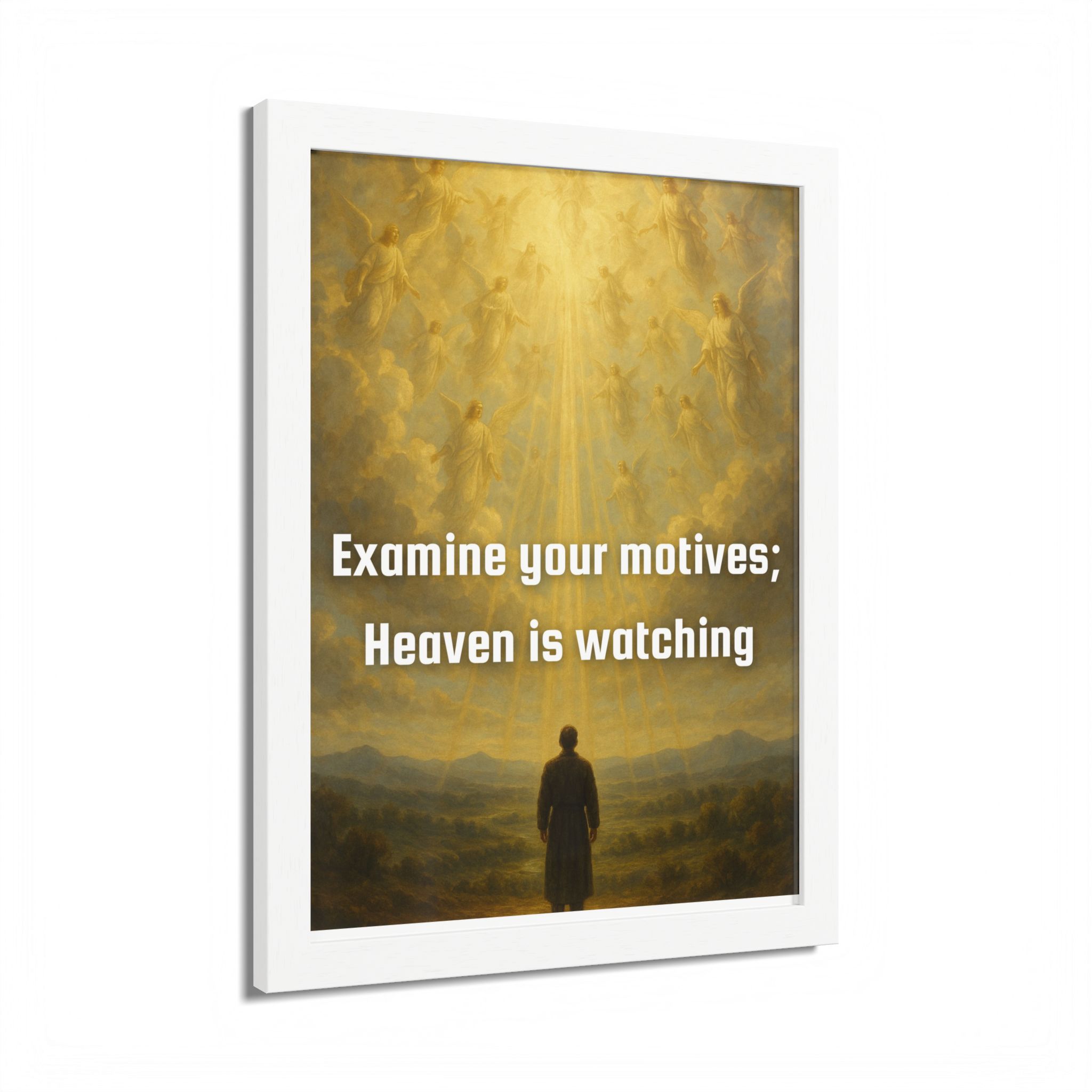 Set beneath a radiant host of angels, this poster is a gentle yet sobering reminder that our motives matter. Heaven sees not only what we do, but why we do it. This piece invites introspection, integrity, and purity of heart.