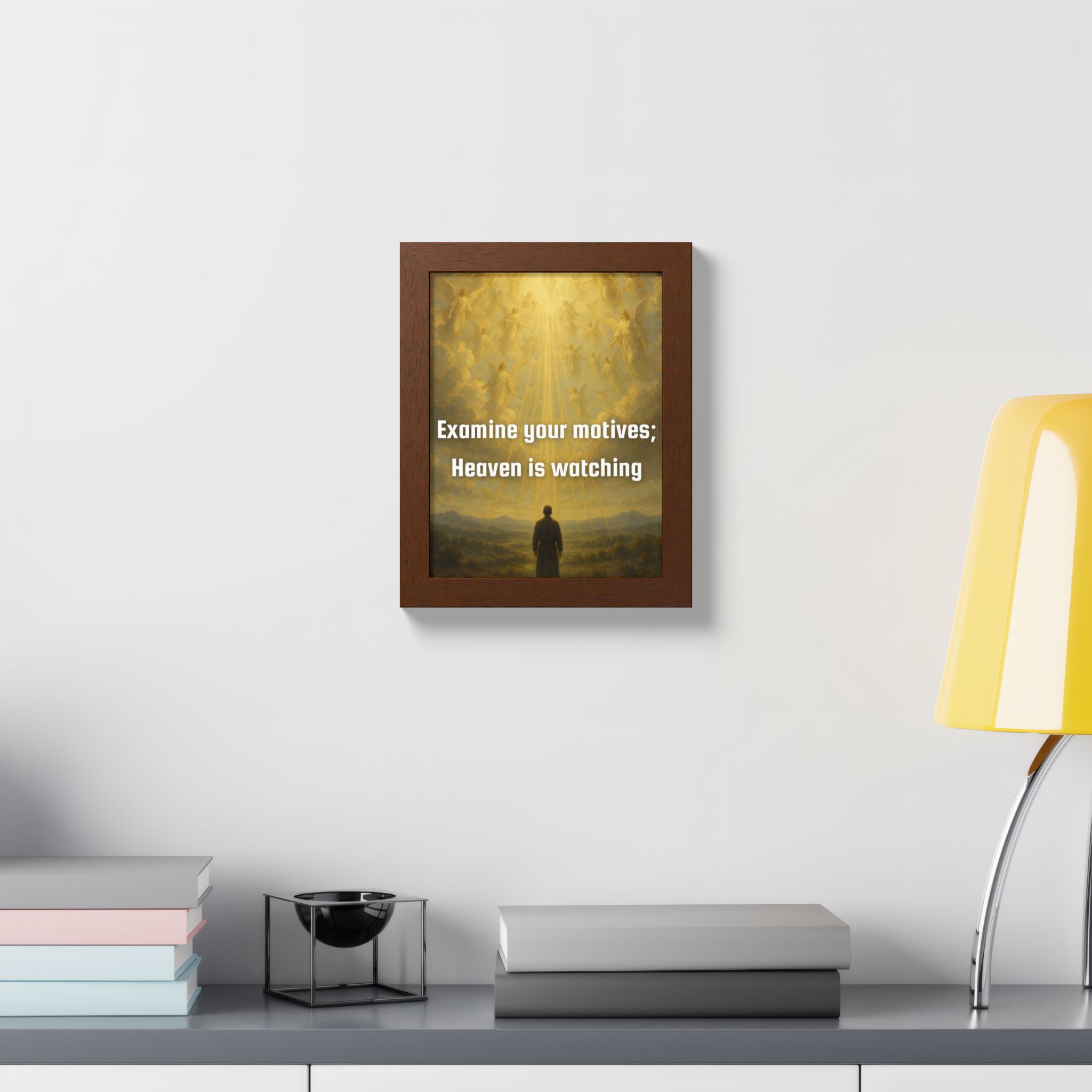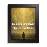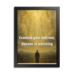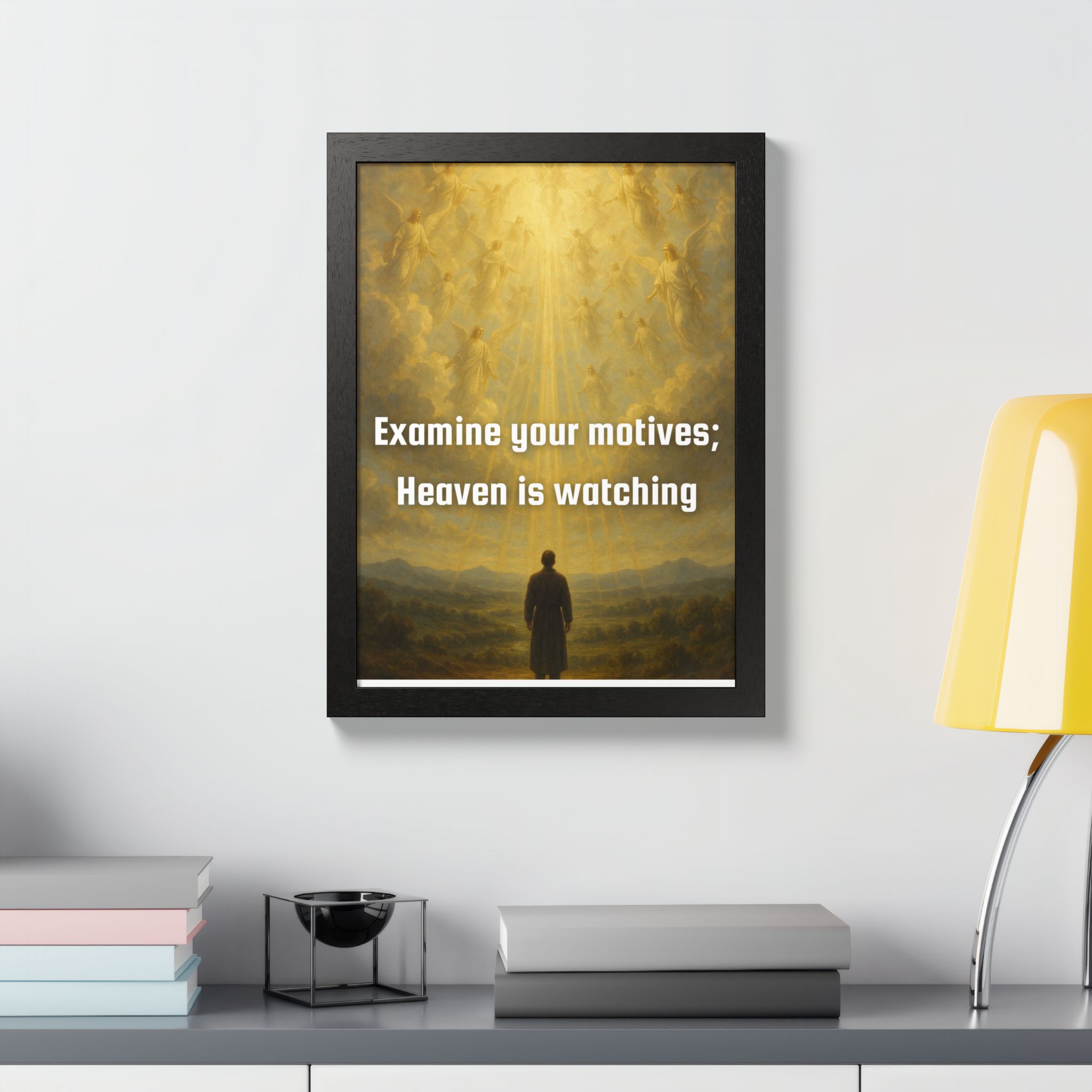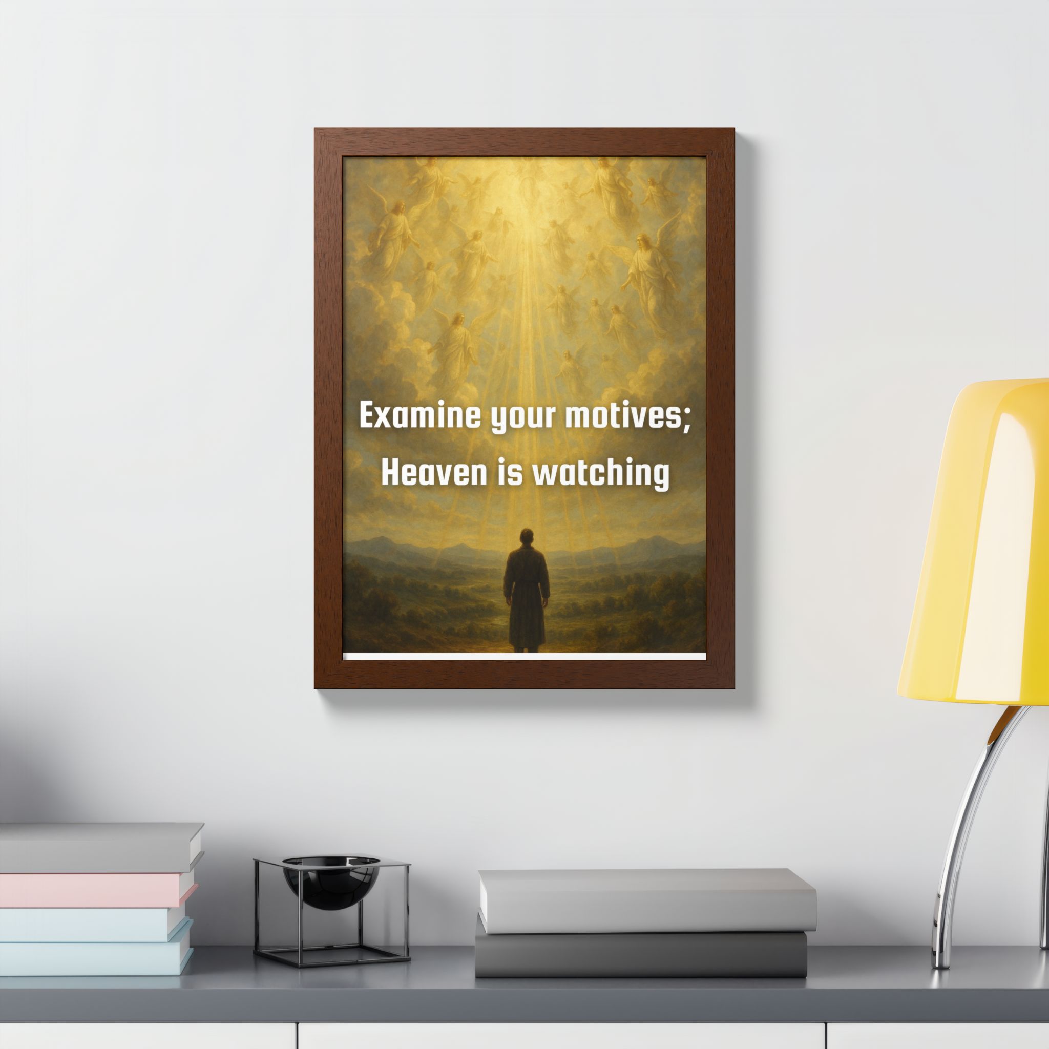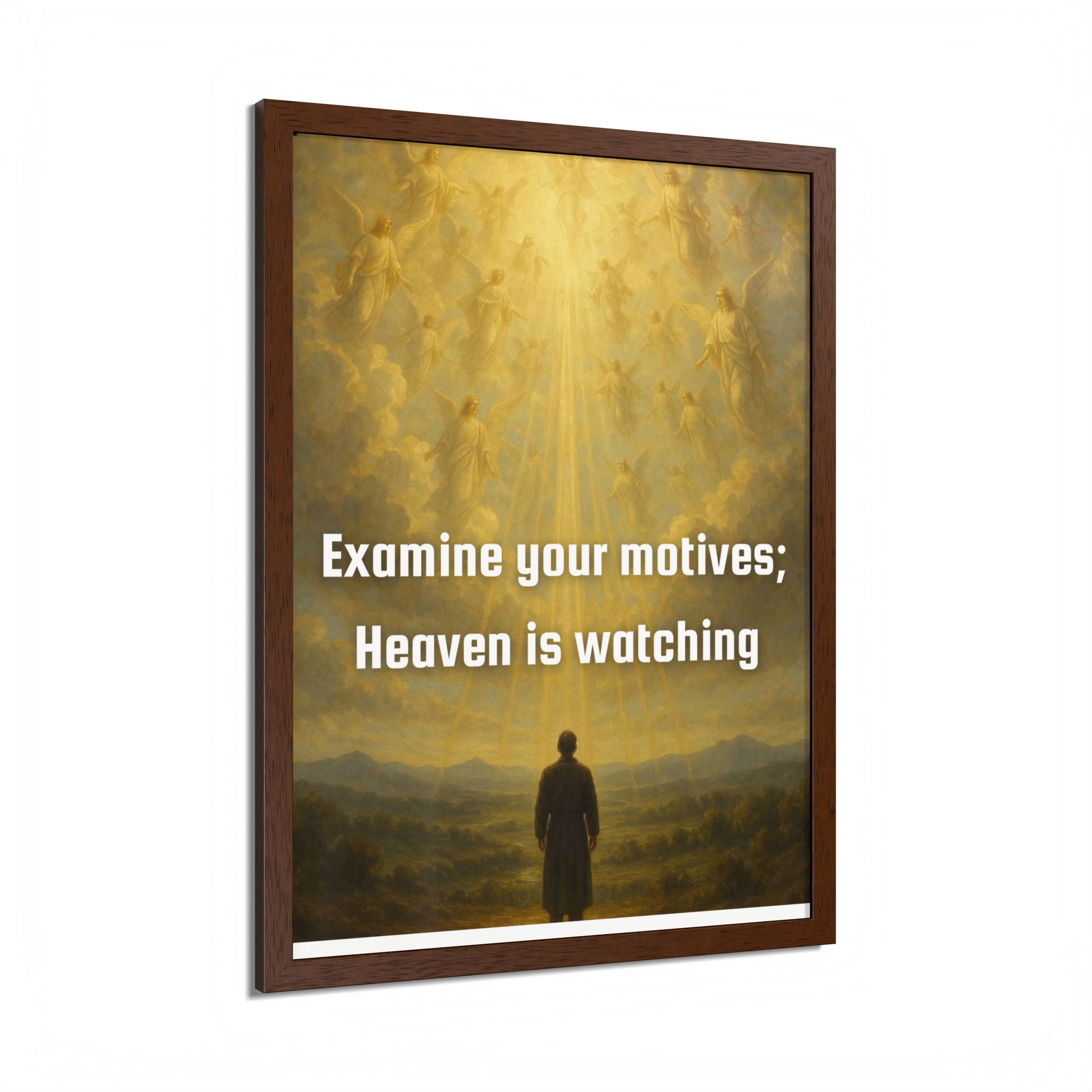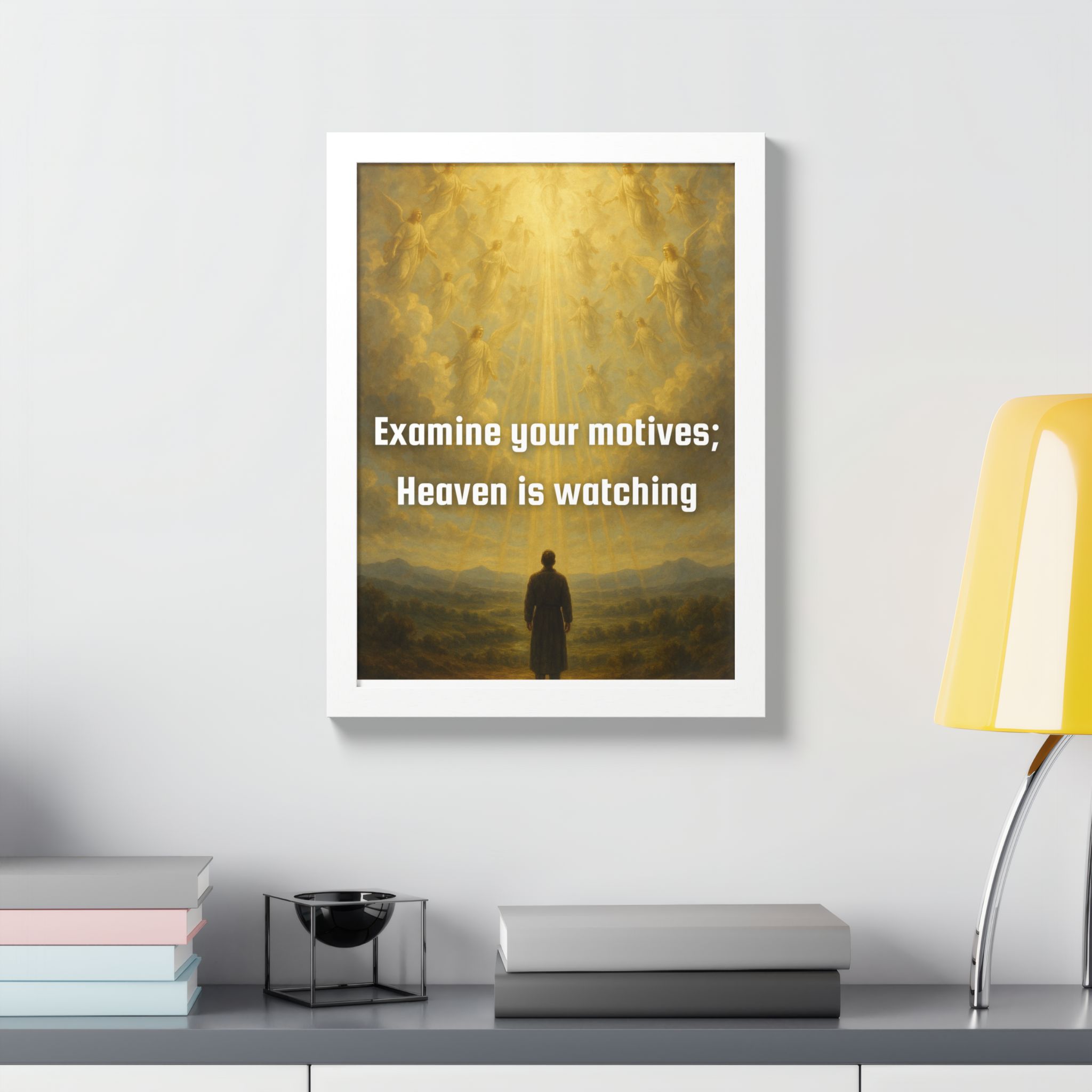 Set beneath a radiant host of angels, this poster is a gentle yet sobering reminder that our motives matter. Heaven sees not only what we do, but why we do it. This piece invites introspection, integrity, and purity of heart.