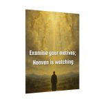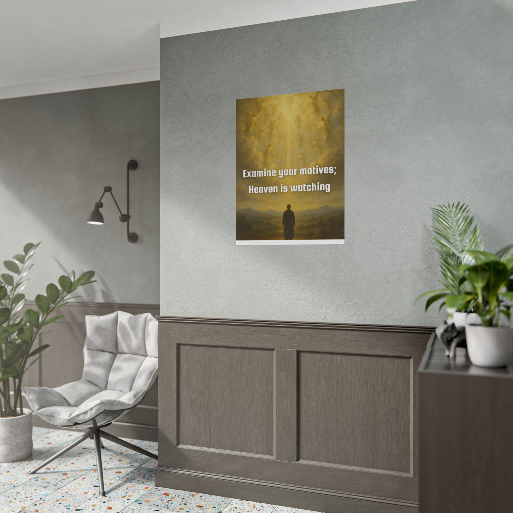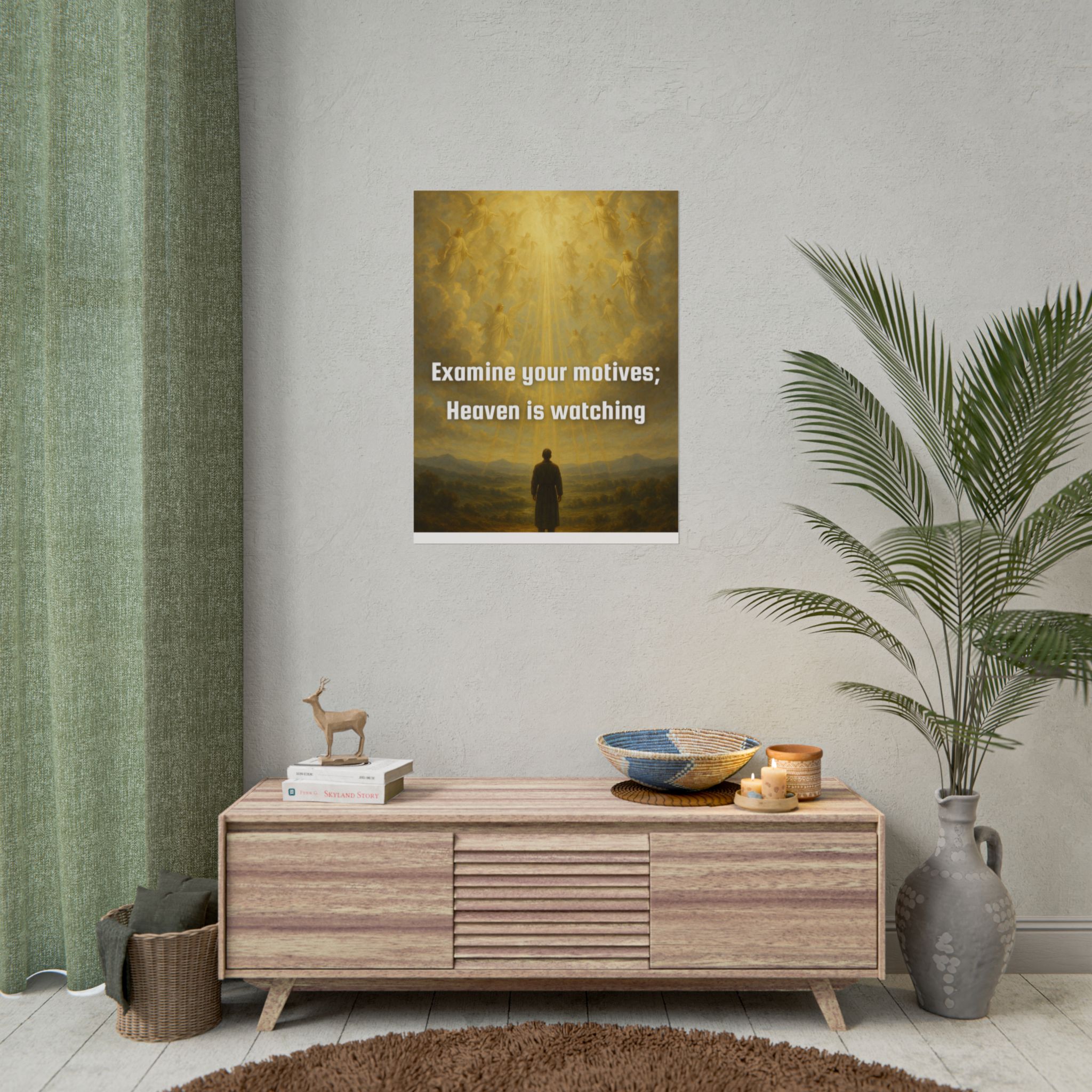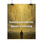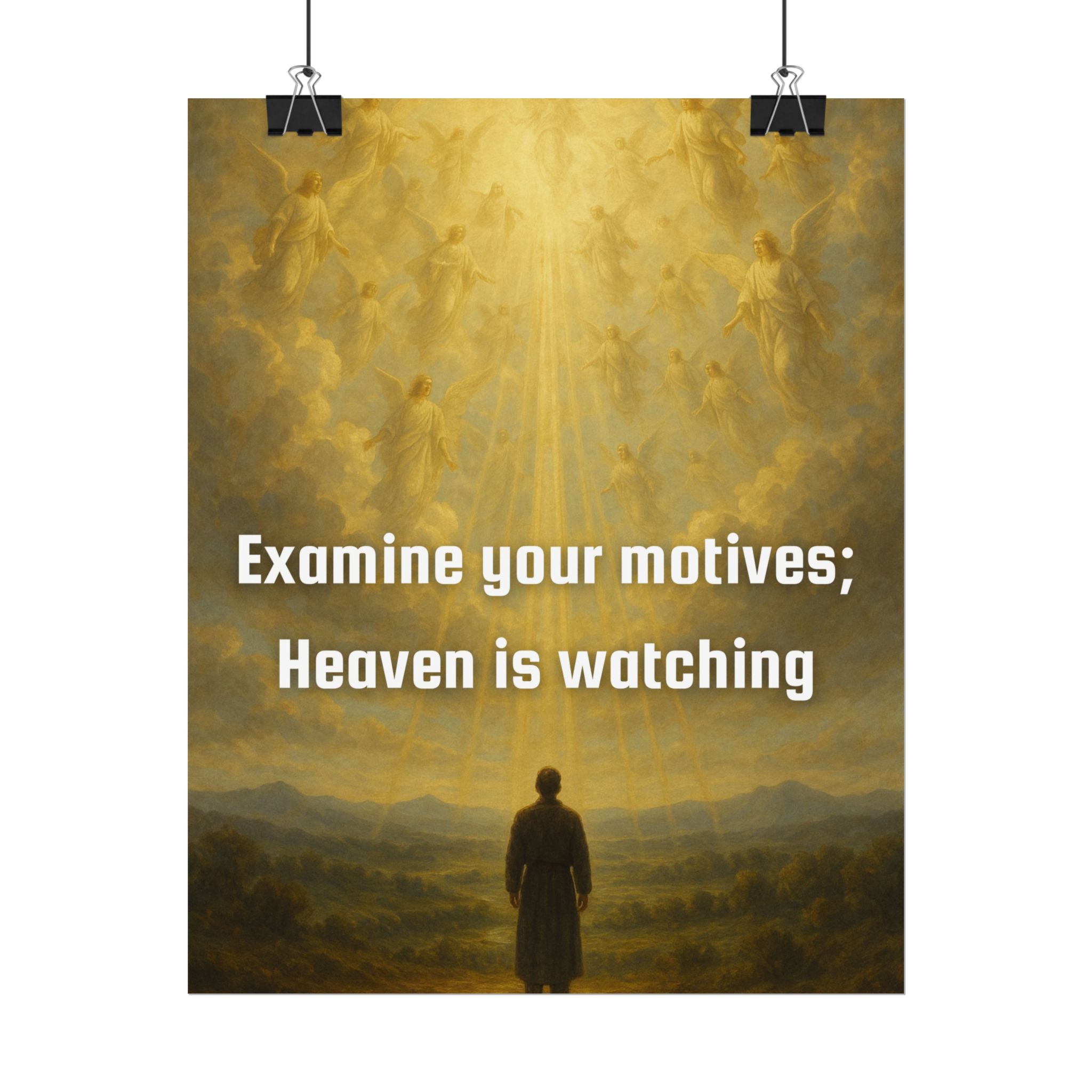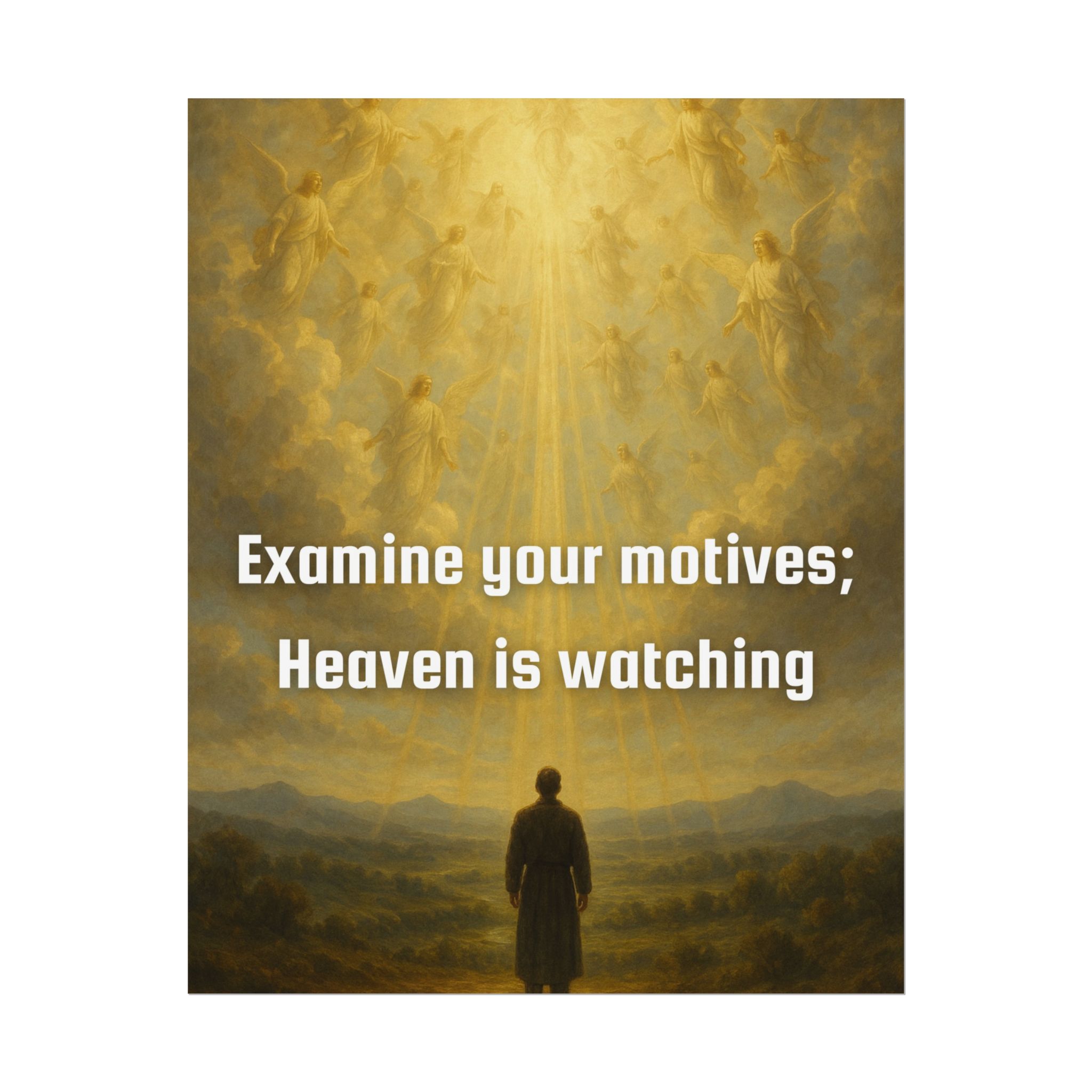 Set beneath a radiant host of angels, this poster is a gentle yet sobering reminder that our motives matter. Heaven sees not only what we do, but why we do it. This piece invites introspection, integrity, and purity of heart.