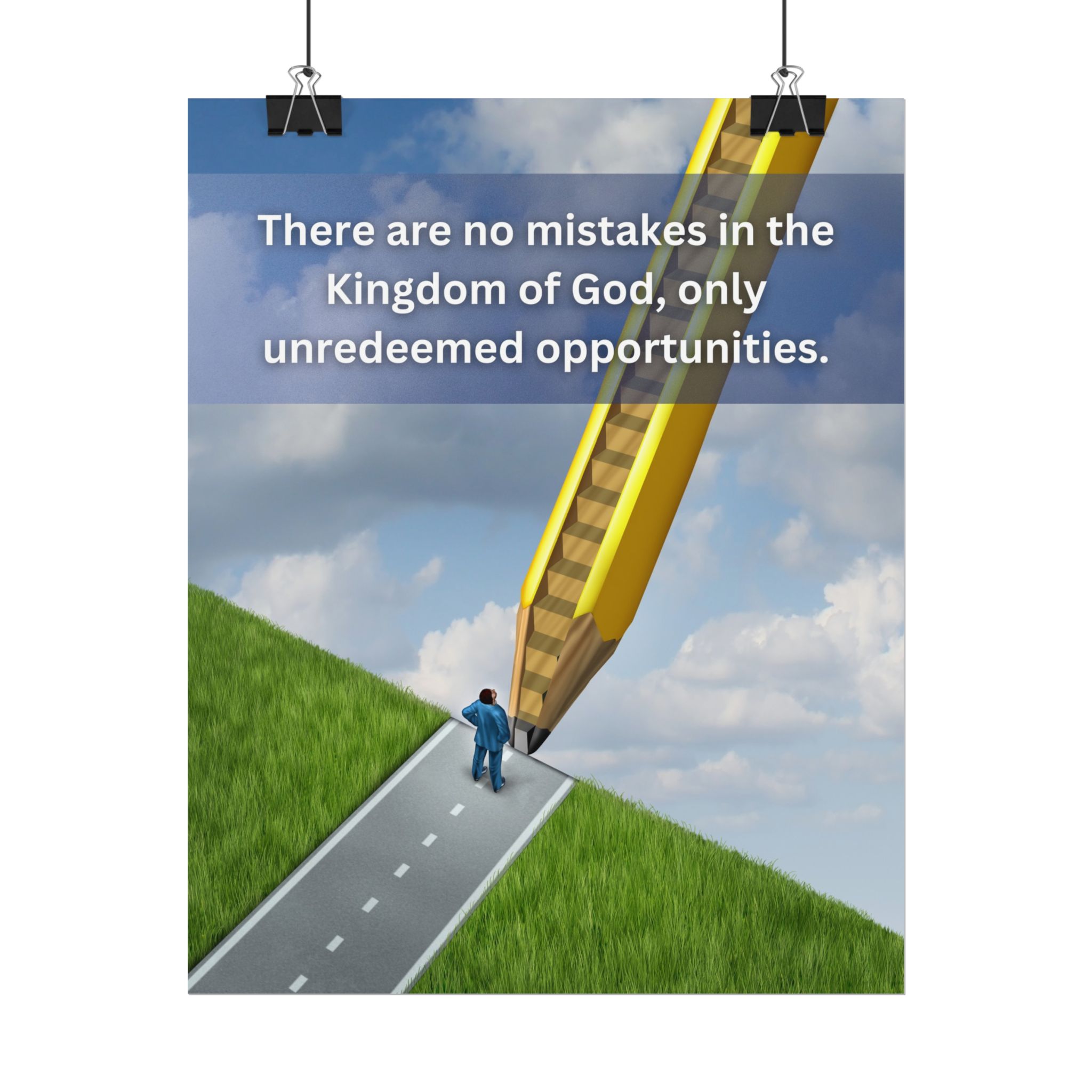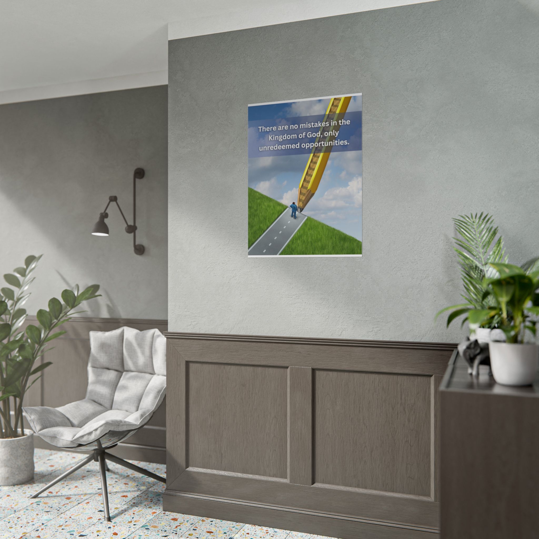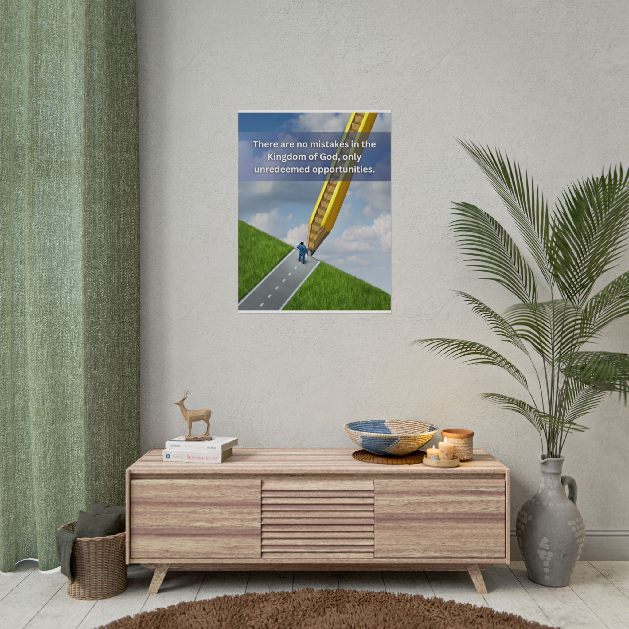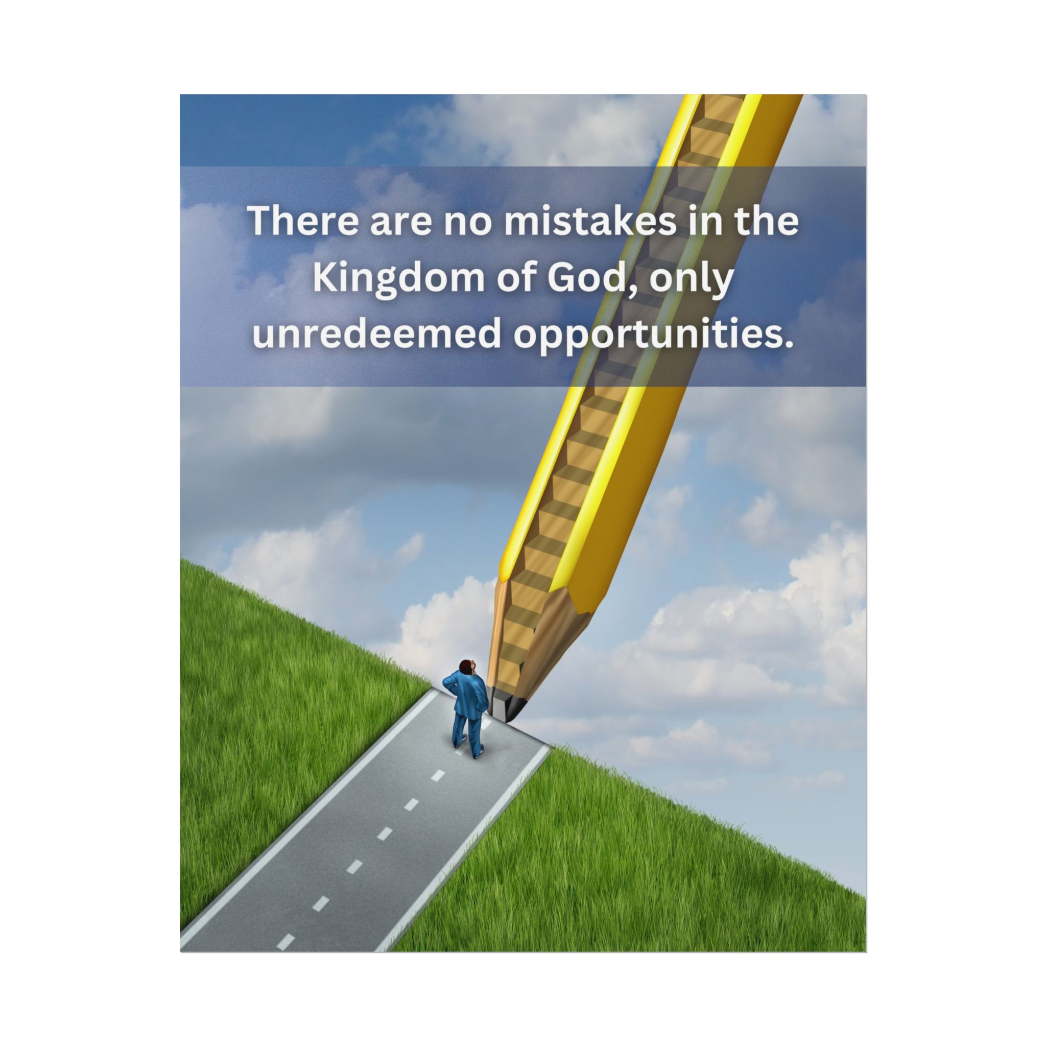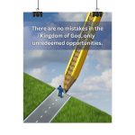 This poster reframes every misstep as raw material for transformation. God wastes nothing — not your detours, not your delays, not your disappointments. The imagery of a road being redrawn reminds us that the Author of our story is still writing, still redeeming, still creating new paths forward.
